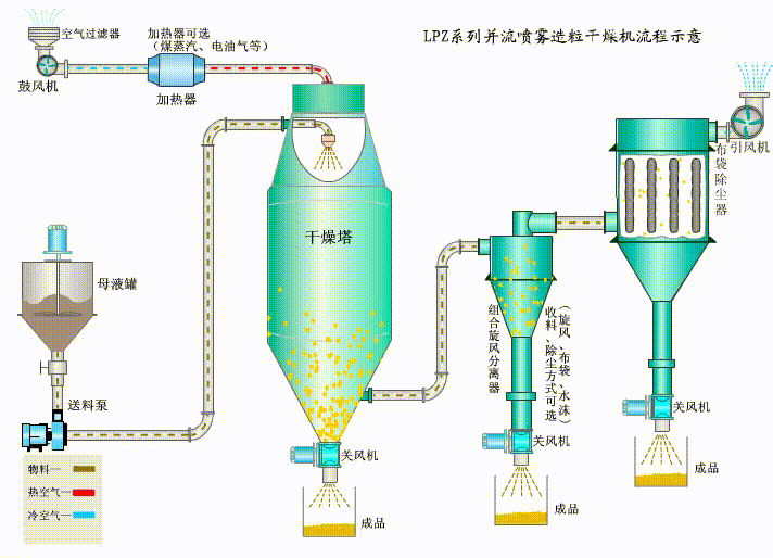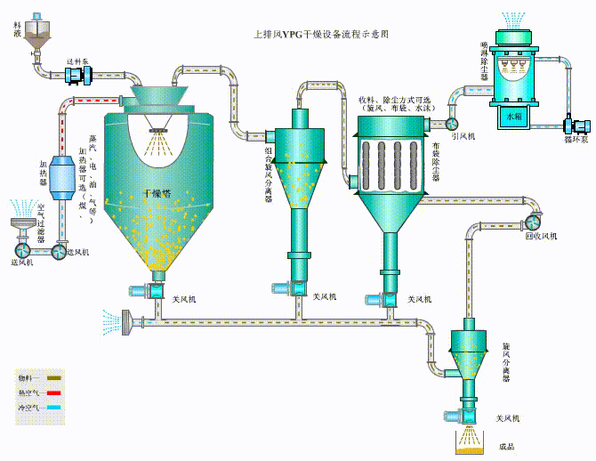 (3)生產(chǎn)過程簡化,操作控制方便。對于含濕量40-60%(特殊物料可達90%)的液體能一次干燥成粉粒產(chǎn)品,控制和管理都很方便。